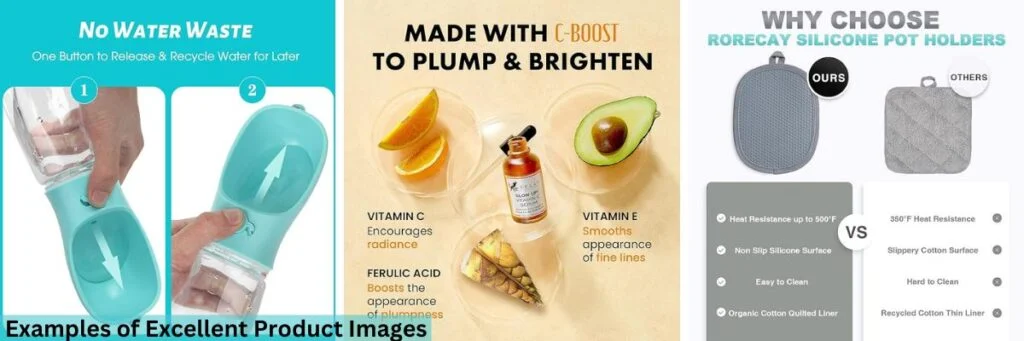 • Underutilizing image slots: This is an easy one to fix, but still needs to be stated. Amazon gives you nine slots for a reason; use them. Try to include a variety of image types like infographics, spec charts, size comparisons, lifestyle images, close-ups, and at least one image that shows someone using the product and looking into the camera. That image almost always boosts trust.