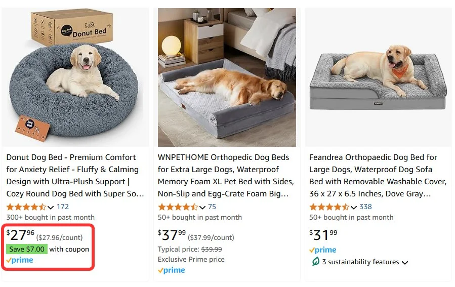 At the same time, discounts go a long way. In my experience, dollar-off coupons almost always outperform percentage discounts. Customers find them easier to understand, and they show up as green badges in search results, grabbing attention and boosting click-through rates. For example, listing your product at $25.99 with a $1 coupon will almost always convert better than just pricing it at $24.99. Plus, not everyone uses the coupon, so you’re still selling a good number at full price.