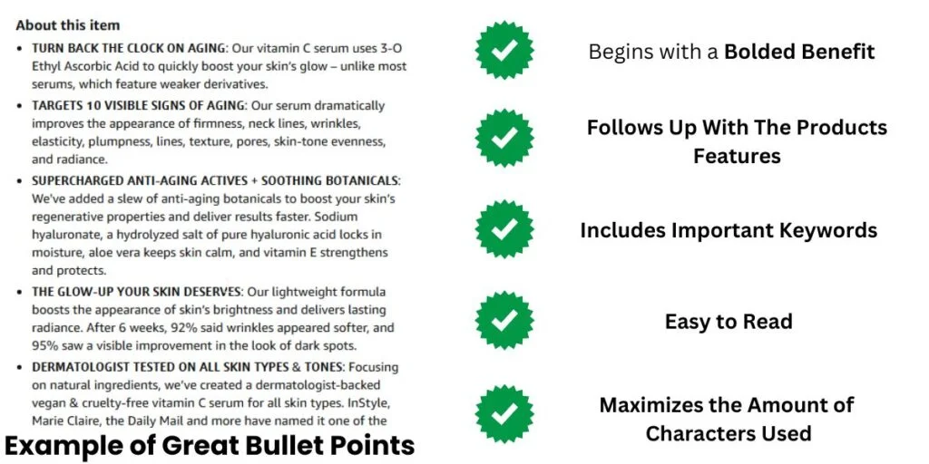 Bullet PointsLead with benefits over features. Use all five bullets. Address common objections found in reviews.Bullets are your quick sales pitch. Shoppers skim, so clarity and relevance win.