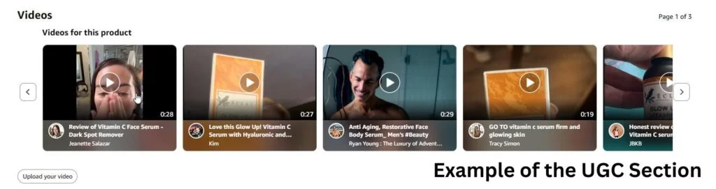 Amazon’s video carousel favors authentic content. When you upload a branded video, it can “pull up” customer-submitted UGC from the bottom of the page into the top carousel. That means videos from the “Videos from Creators” section, typically located near the bottom of your listing, get more visibility. When shoppers see real people using your product, the perceived risk drops, and buying confidence goes up.